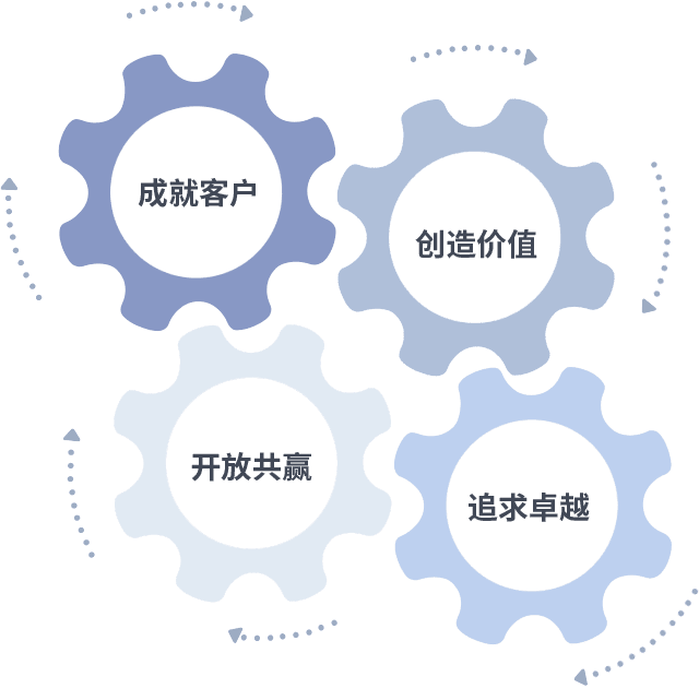 成就客户是一切决策的出发点,,,创造价值是衡量所有工作的标准,,,追求卓越是我们做事做人的态度,,,,开放共赢是我们的格局也是最终的结果。。。价值观的齿轮环环相扣,,推动着组织里的每个人不断向前。。。