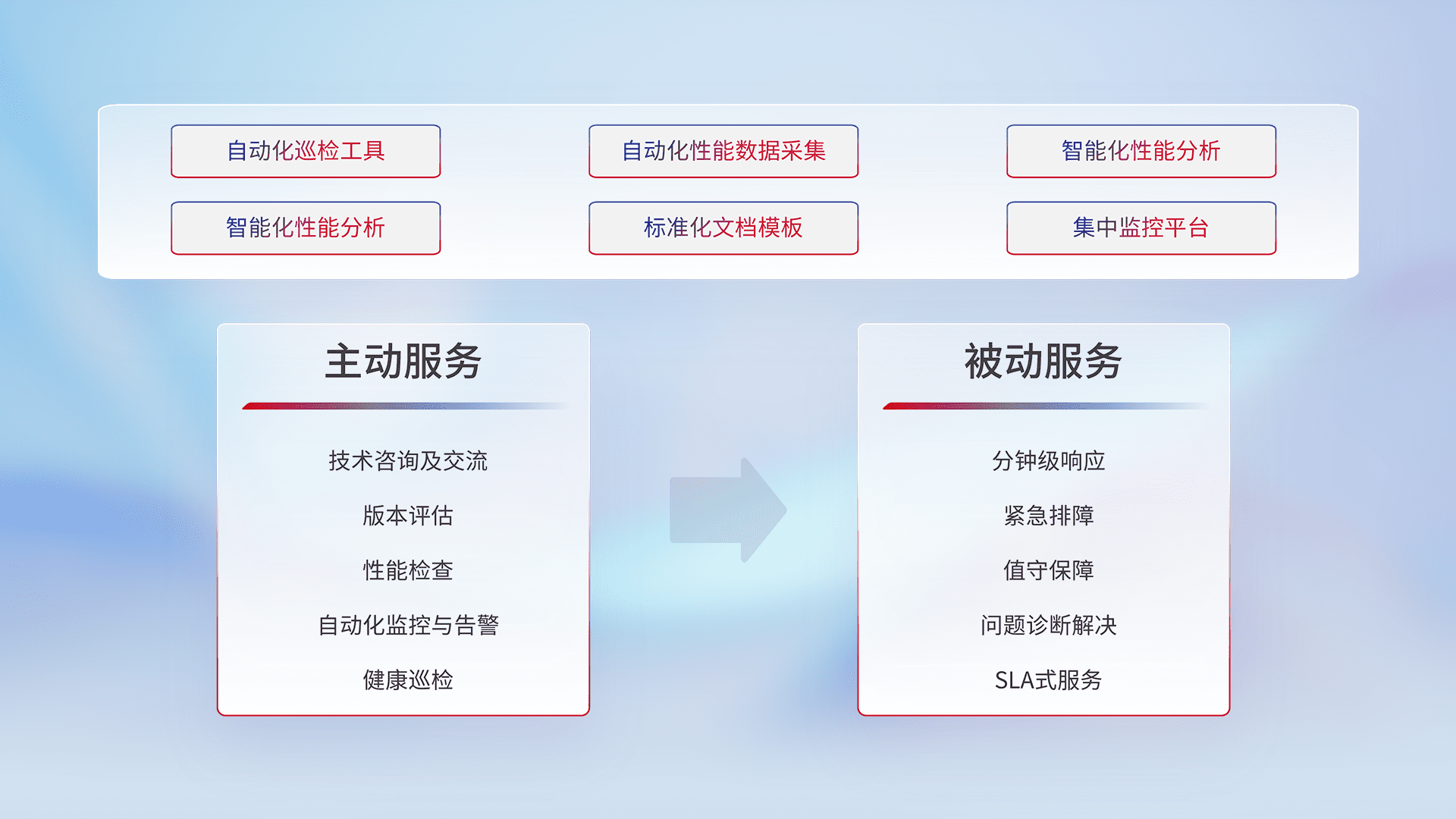 智能化工具和标准化文档,,,保障服务质量,,提供主动服务(包含技术咨询、、版本评估、、性能检查、、、自动化监控与告警、、健康巡检)和被动服务包含(分钟级响应、、紧急排障、、值守保障、、、、问题诊断解决、、、SLA服务)。。。。